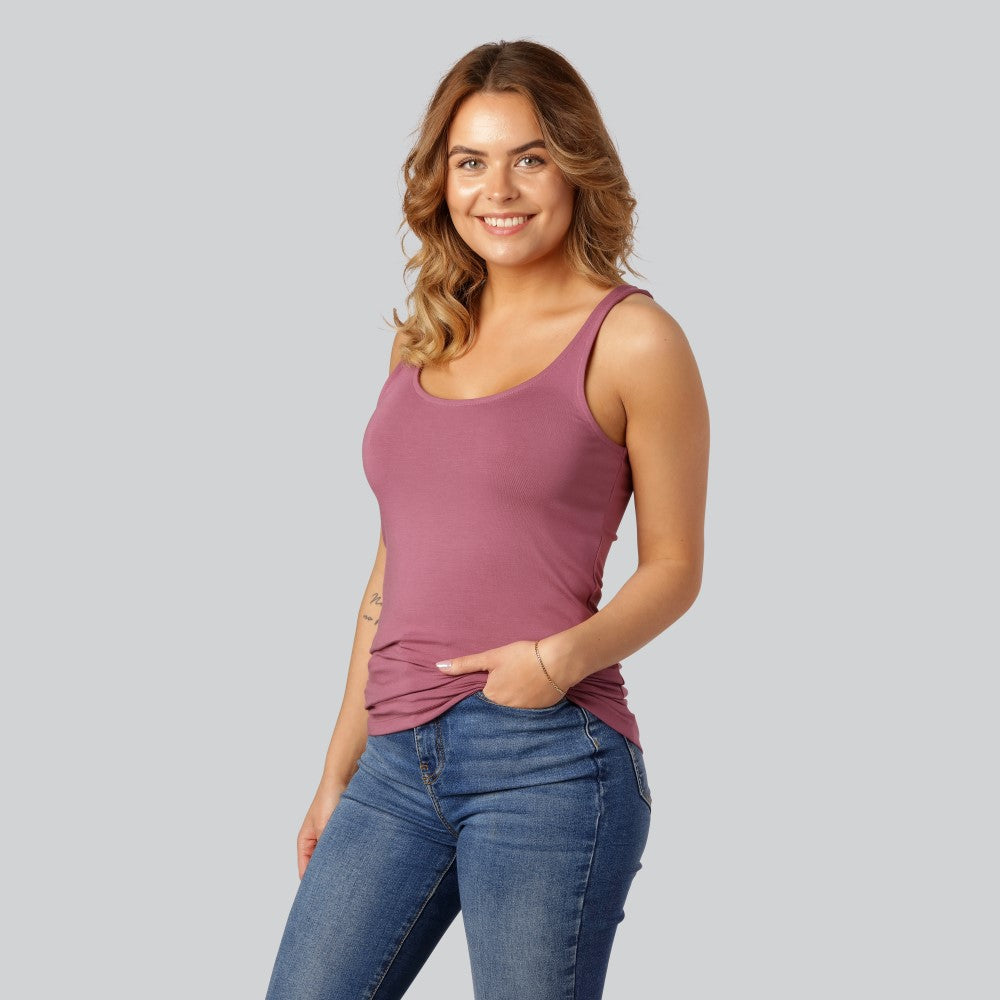 Oplev vores ultra bløde dusty rose bambus dame top med bred strop Vores dusty rose bambus top med brede stropper er udviklet med tanken om en sammensmeltning af feminine toner, ultimativ komfort og ekstraordinært velbehag. Det er alle vores bambus toppe t