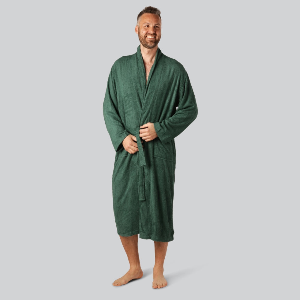 Lækker grøn bambus morgenkåbe til mænd Vores luksus grønne bambus morgenkåbe til mænd er helt fantastisk som gaveidé eller dig, som blot gerne vil have en lækker og ekstremt komfortabel morgenkåbe i en unik og elegant farve. Den giver dig følelsen af luks
