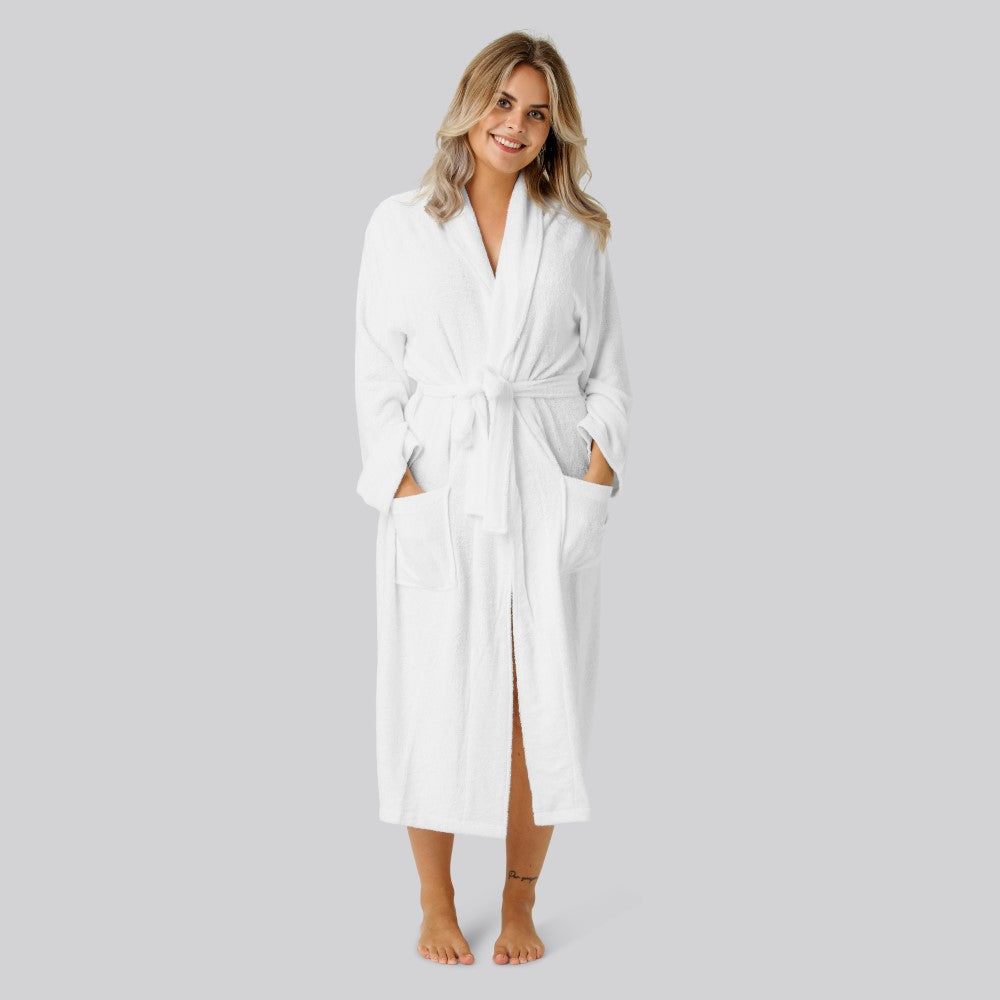 Lækker multifunktionel hvid bambus morgenkåbe til kvinder Der er ingen følelse bedre end at hoppe ud af badet, tørre sig og omfavne sig i sin lækre hvide bambus morgenkåbe. Når du får din nye hvide bambus morgenkåbe får du den lækre, velkendte luksusfølel