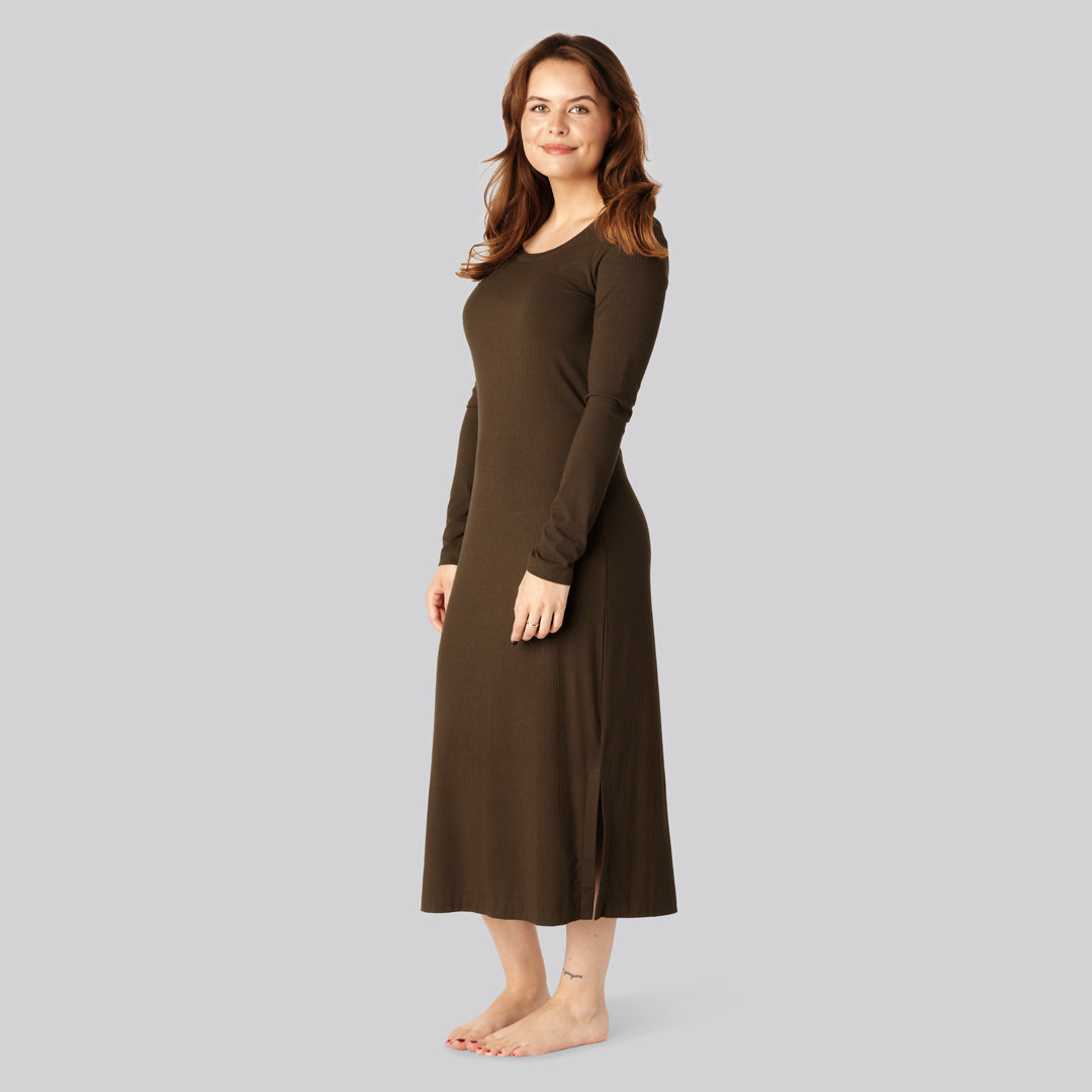 Stilfuld brun ribbet langærmet kjole i blød bambusviskose Oplev elegance og komfort i ét med denne smukke ribbede langærmede bambus kjole i en varm brun nuance. Kjolen er skabt til at omfavne kroppen med sin bløde, strækbare ribkvalitet, som smyger sig fl