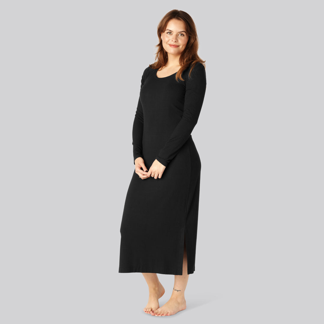 Sort bambus ribbet langærmede kjole der aldrig går af mode Få elegance og komfort i ét og samme kjole med vores bambus ribbet langærmet kjole i sort – et must-have i enhver garderobe. Kjolen er fremstillet i en blød og strækbar tekstilblanding, der inde