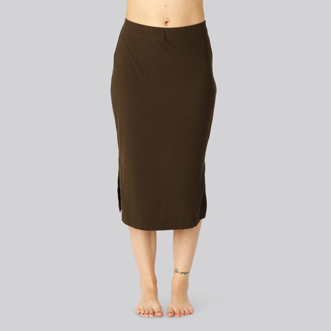 Stilfuld bambus ribbet nederdel i flot brun Denne smukke ribbede bambus nederdel i brun er et alsidigt og stilfuldt valg, som vil opgradere enhver garderobe. Nederdelen har en flatterende og god pasform, der fremhæver din figur, mens den ribbede struktur
