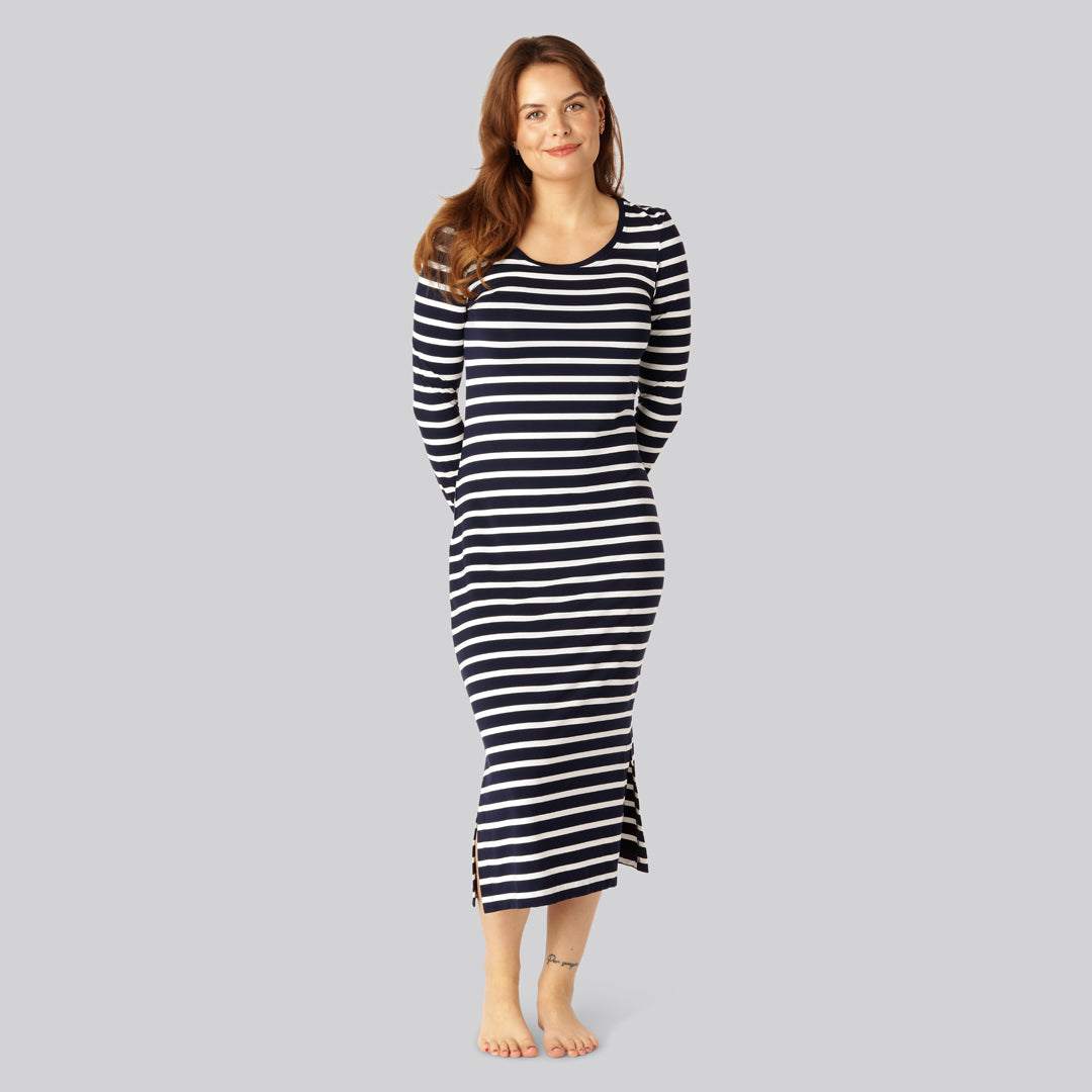 Langærmede bambus kjole i navy med hvide striber – stilren, blød og alsidig Denne langærmede bambus kjole i navy med hvide striber, er et stilrent valg til dig, der sætter pris på komfort, enkelhed og et snit, der kan bruges året rundt. Med sine klassis