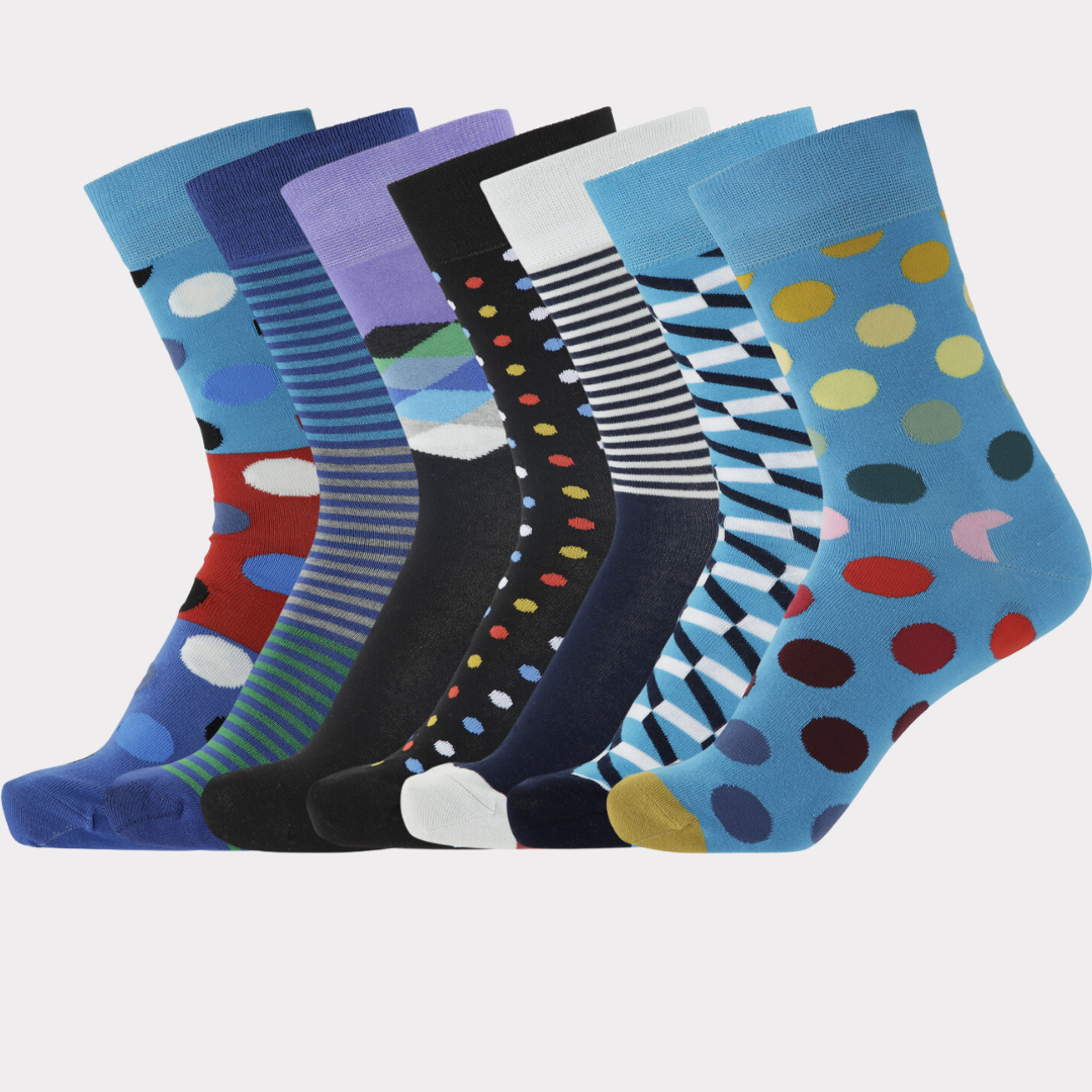 Farverige og ultrabløde bambus strømper til den stilbevidste mand Tilføj et strejf af farve til din garderobe med vores sæt af 7 par farvede bambus strømper, designet til den modige mand, der tør at kaste sig ud i multifarvede strømper uden, at gå på komp