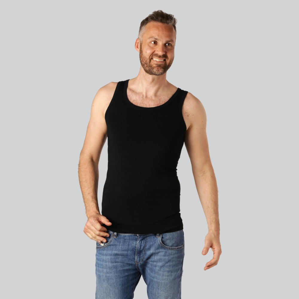 Komfortabel og strækbar sort bambus undertrøje Praktisk påklædning er noget af det bedste! Så er du heldig, for det kan vores bambus undertrøjer til mænd betegnes som. Vores sorte bambus undertrøje har brede stropper, som betyder for dig, at den egner sig