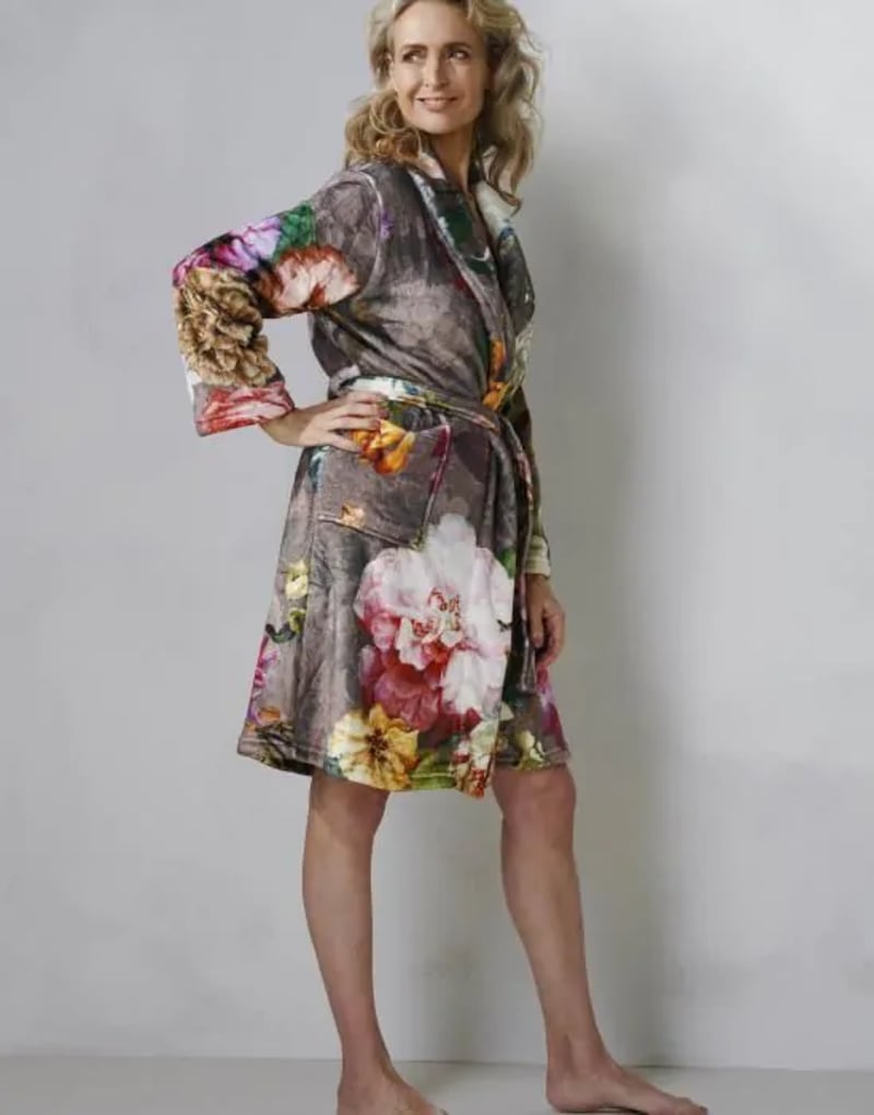 Denne M Fleur badekåbe i farven taupe er lavet af 100% polyester, hvilket gør den blød og behagelig at have på. Badekåben er fra mærket Essenza og er af høj kvalitet. Den er perfekt til at tage på efter et varmt bad eller som en hyggelig morgenkåbe. Badek