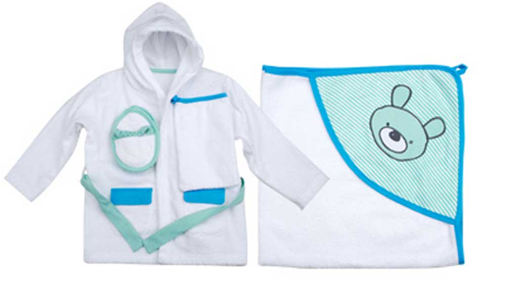 Nu kan du købe den bedste pakke til den lille nye baby. I pakken får du, de fineste små badesko, en lækker varm morgenkåbe, et hættehåndklæde og en vaskehandske. Du kan bruge håndklædet til at svøbe baby i efter et brusebad. Der er det fantastisk blødt og