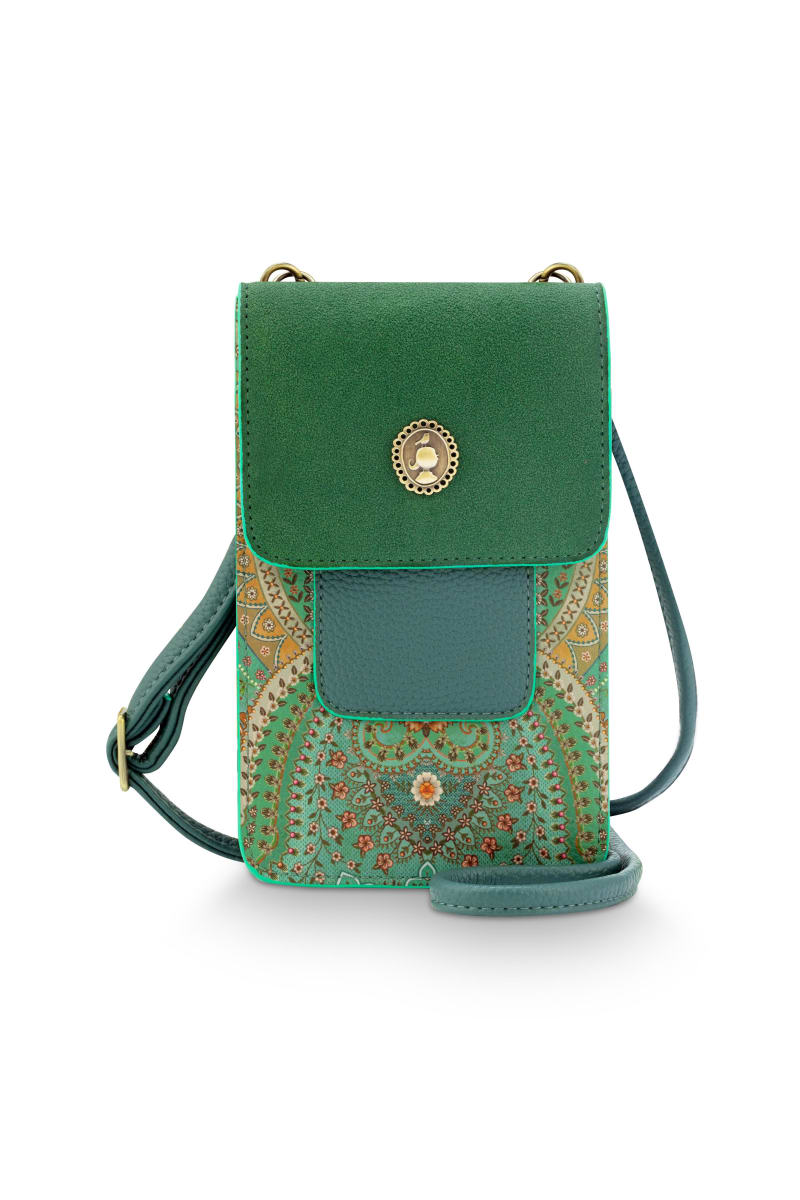 Introducerer Peggy Phone Bag Jabali Green fra Pip Studio. En moderne og sofistikeret tilføjelse til din garderobe, der er både praktisk og stilfuld. Denne taske er lavet med en 50% PU og 50% polyester blanding, hvilket giver den en elegant og holdbar fini