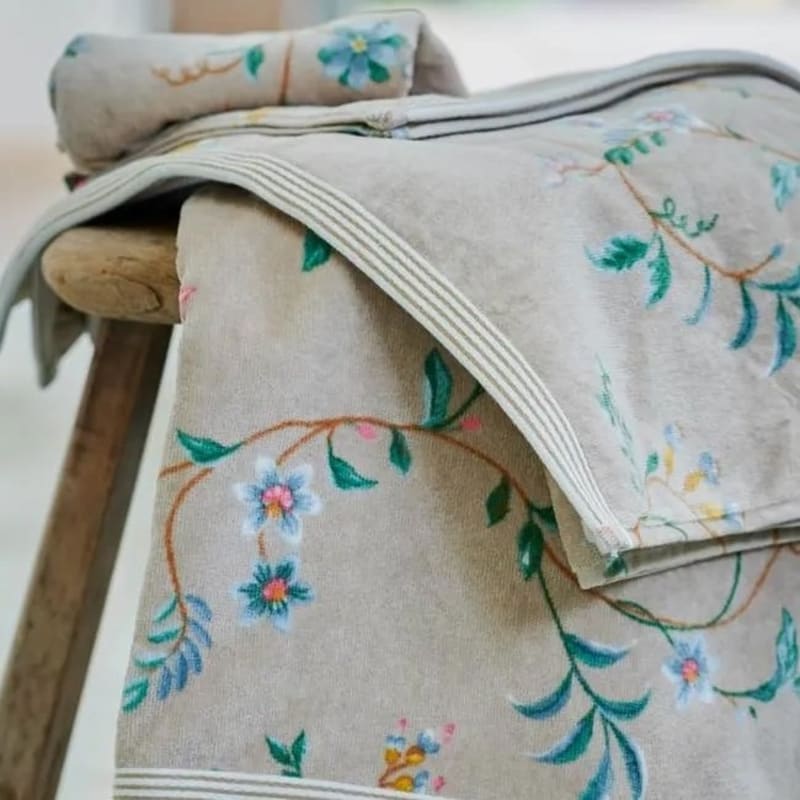 Oplev et strejf af luksus hver eneste dag med PIP Les Fleurs Khaki 55×100 håndklæde fra Pip Studio. Dette yderst behagelige håndklæde er fremstillet i 100% bomulds velour frotte, der sikrer en ekstra tyk og blød fornemmelse mod huden. Vores håndklæde er d