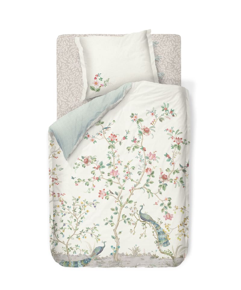 DK PIP Okinawa white 140×200 er et luksuriøst og stilfuldt dynebetræk fra det populære mærke Pip Studio. Betrækket har en flot blå farve og et smukt mønster med blomster og fugle, som er typisk for Pip Studios design. Det er lavet af percale bomuld, som e