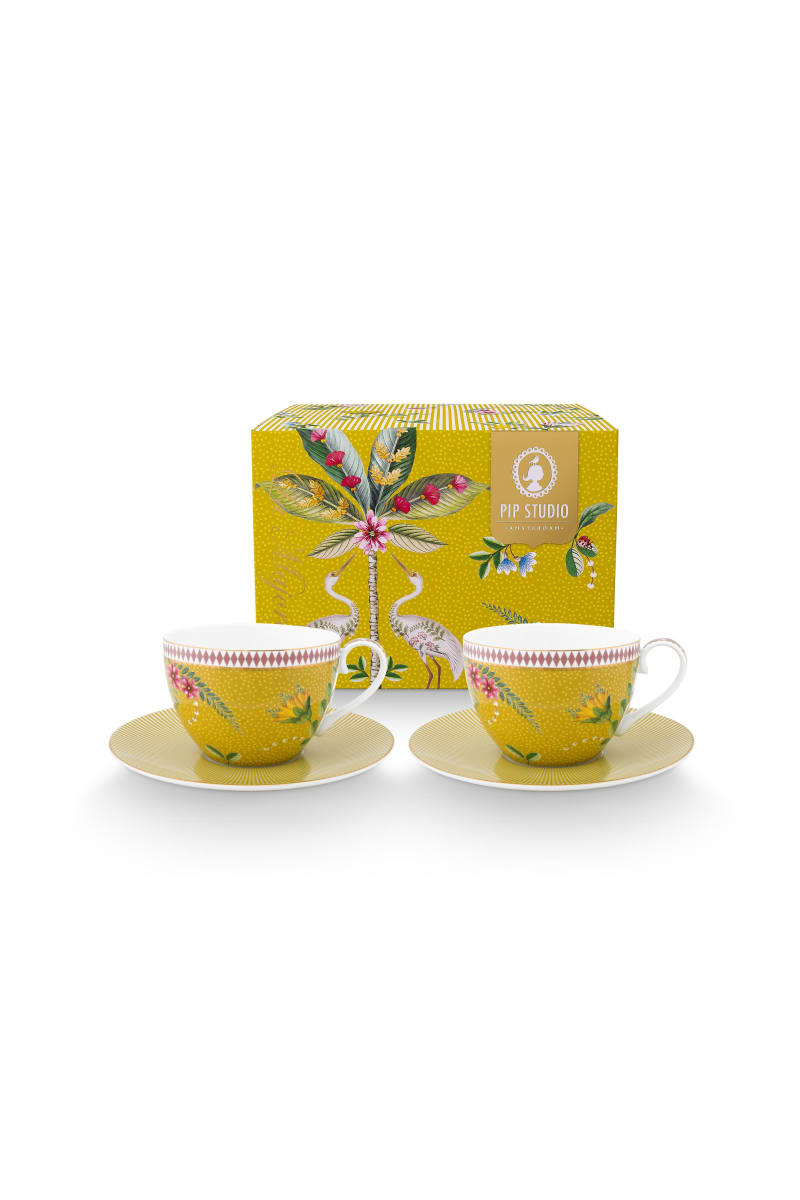 Dette sæt bestående af 2 kopper og underkopper fra Pip Studio er en del af deres smukke La Majorelle-serie. Kopperne har en kapacitet på 280 ml og er perfekte til at nyde din yndlingskaffe eller te i. Med deres lyse gule farve vil de tilføje et strejf af