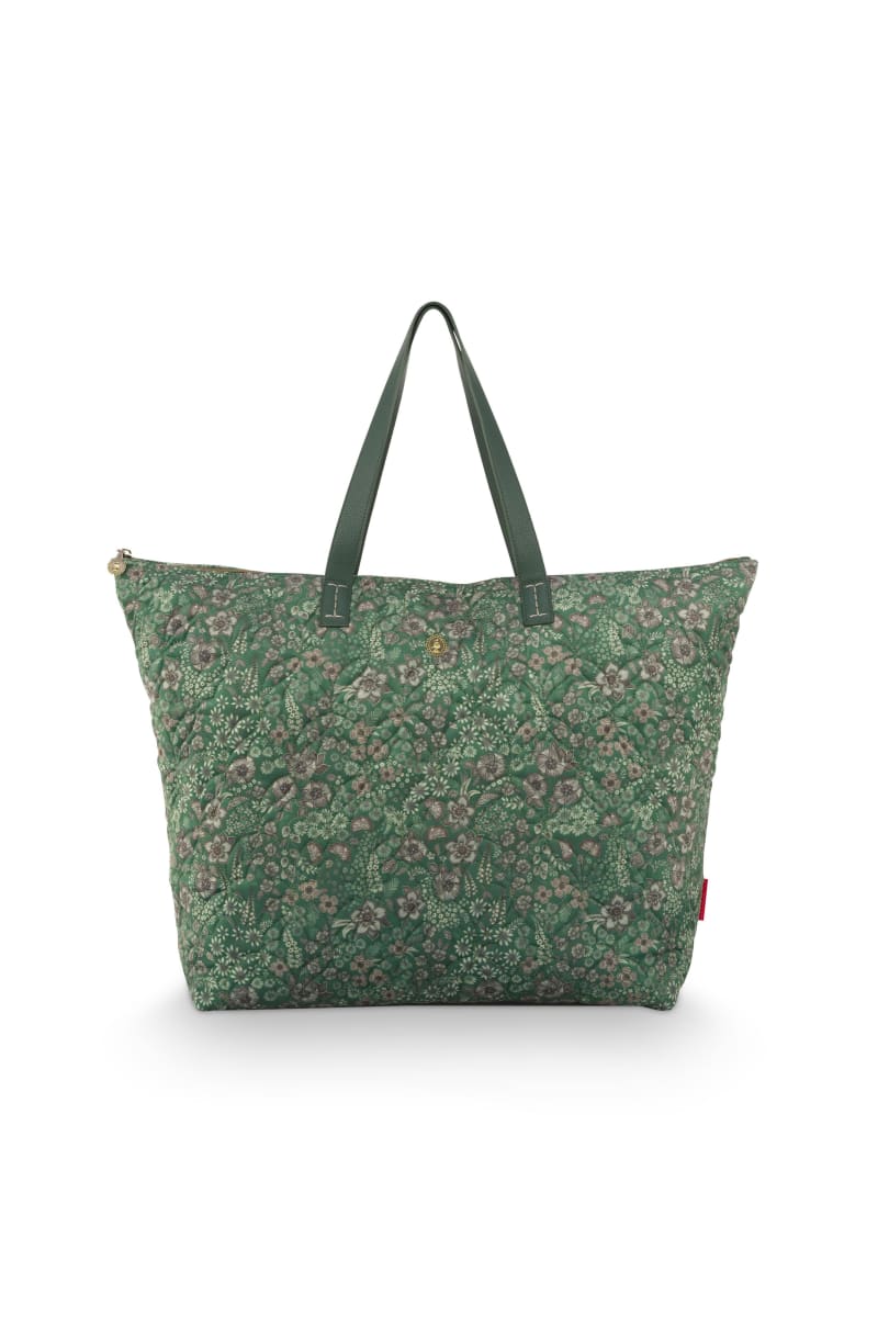 Præsenterer Tilda Tote Bag Large Quilted Daisy Dreams Green 66x20x44cm fra Pip Studio. Denne elegante taske er perfekt til hverdagsbrug eller til rejsen. Farven er en smuk grøn, der vil skille sig ud og tilføje et strejf af farve til enhver garderobe. Tas