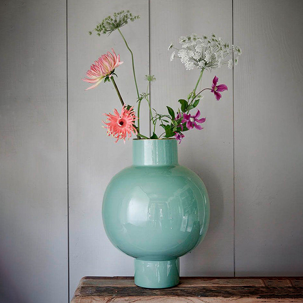 Stor metalvase fra Pip Studio i Soft Green-designet. Denne imponerende vase har en størrelse på 31,5×42 cm og tilføjer en elegant touch til enhver indretning. Vasen er lavet af holdbart metal og har en smuk blød grøn farve. Med sin store størrelse kan den