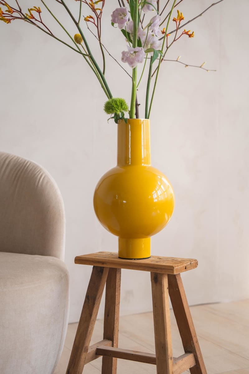 Denne smukke vase fra mærket Pip Studio er perfekt til at tilføje et strejf af farve til dit hjem. Vasen er fremstillet af metal og har en medium størrelse på 24×40 cm. Den har en varm, okkerfarvet nuance, som passer perfekt til en moderne indretning. Vas